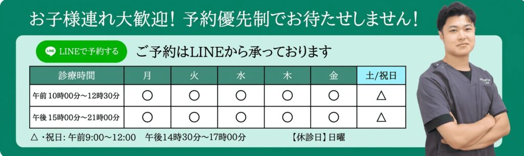 土曜・祝日も営業しており平日は午前中10:00〜12:30、午後は15:00〜21:00まで受付しております。土曜日・祝日は午前中9:00~12:00、午後14:30~17:00までの受付です。