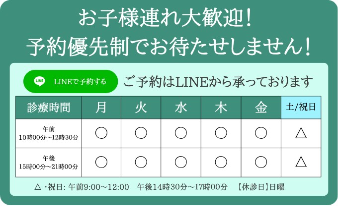 平日21時まで土曜日/祝日17時まで受付しています