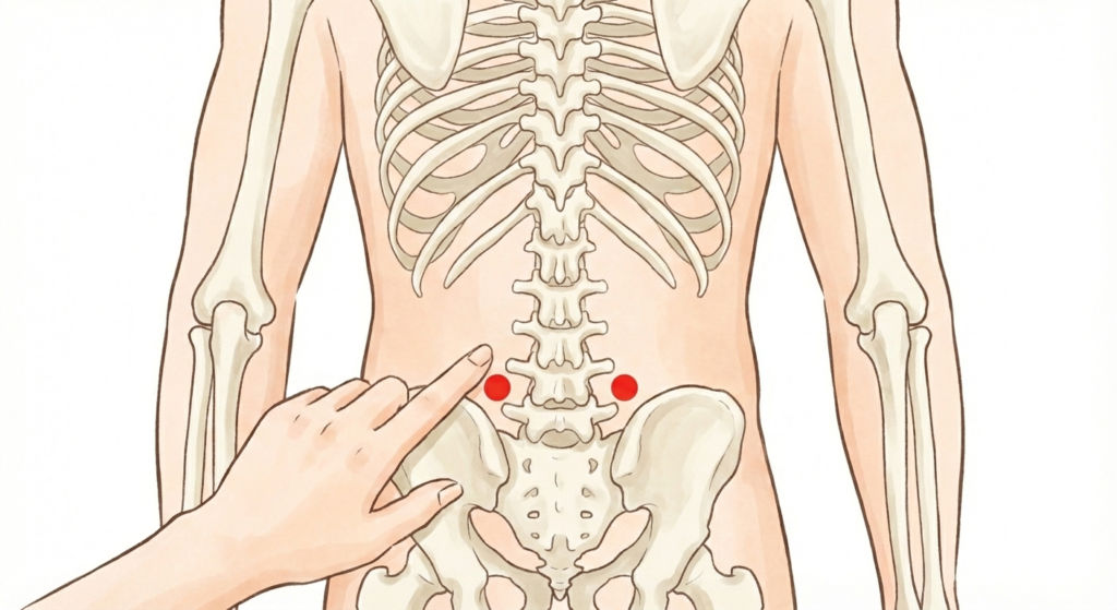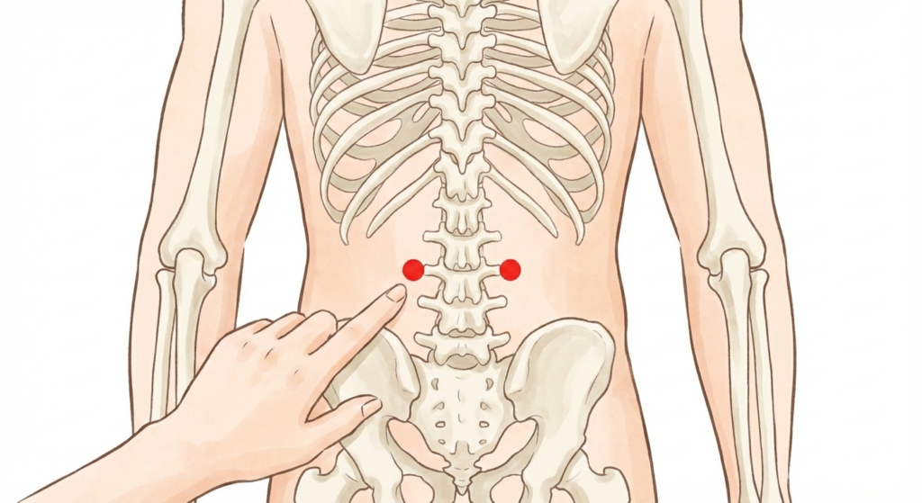 ツボの場所はウエストラインよりやや下あたりでお尻の骨盤の一番高いラインで背骨から左右に約1〜2センチ外側にあります。