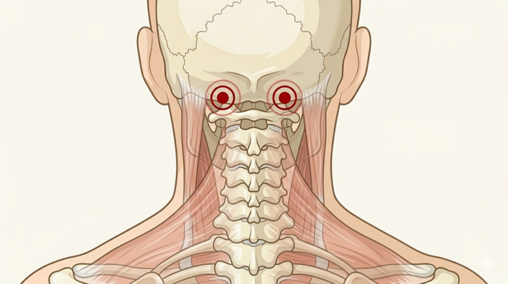 場所は、後ろの首の上あたりで、耳の後ろの骨と首の真ん中のくぼみの間にあります。左右に1つずつあり、押すと少し気持ちいい場所が目印です。